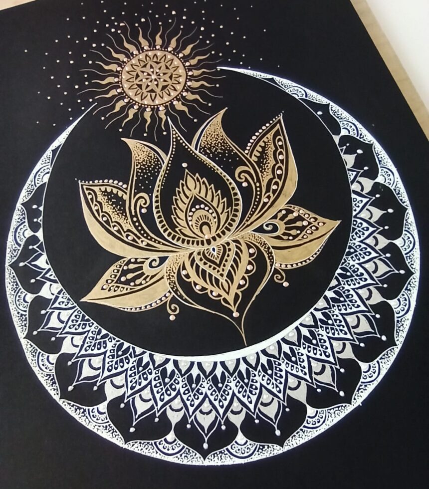 Mandala Lotos je malovaná na umělecký papír s vysokou pigmetací a gramáží. Mandala je malována bílými a zlatými linery, lihovými fixy a gelovými perami. Papír i fixy jsou světlostálé. Pečlivé detaily jsou dozdobené tekutými perlami. Obraz je zarámovaný a zadní strana je opatřena háčkem pro snadné zavěšení na zeď